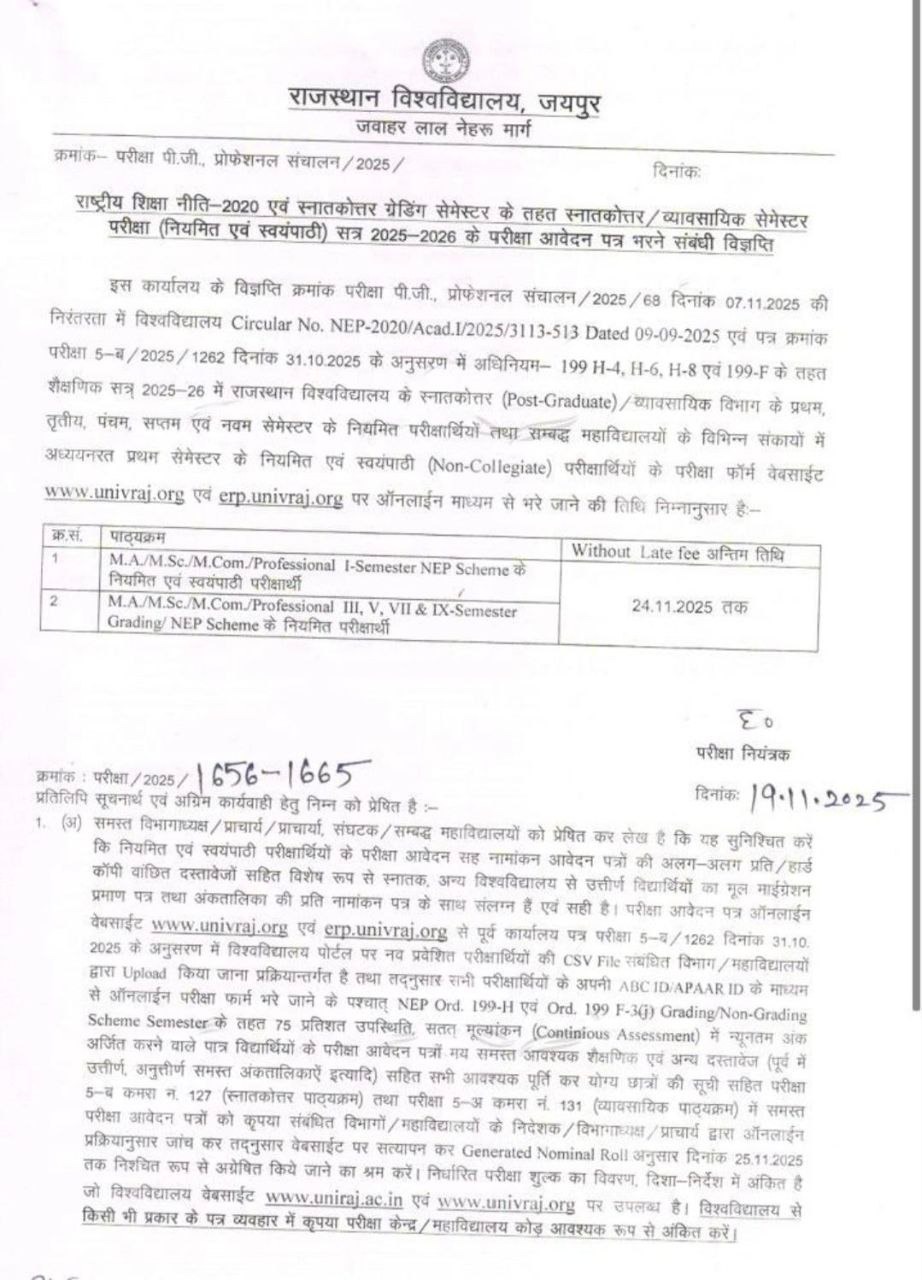 राजस्थान यूनिवर्सिटी MA 1st सेमेस्टर एग्जाम फॉर्म लेटेस्ट अपडेट